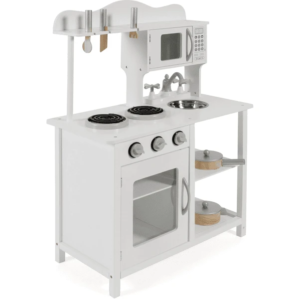 De mooie houten keuken is uitgerust met twee kookplaten met draaibare bedieningsknoppen, een oven, een magnetron met veelkleurig bedieningspaneel en een verwijderbare spoelbak met kraan. Keukenaccessoires omvatten een pan met deksel, een koekenpan met deksel, een lepel, een mes en een houten vork. Alle knoppen maken realistische klikgeluiden.
