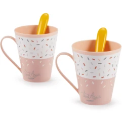 - De set bestaat uit vier serviezen, elk bestaande uit 3 borden, een mok, een beker en bestek.