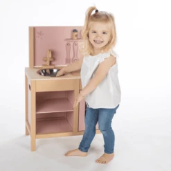 - De keuken is gemaakt van hoogwaardig FSC-gecertificeerd hout en is geschilderd met kindvriendelijke verf op waterbasis in een mooie roze tint.