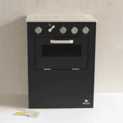 - Het speelgoedfornuis heeft drie platen, de ovendeur gaat open dankzij een draaischarnier en de houten knoppen maken leuke klikgeluiden.