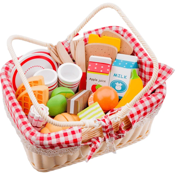 Deze 27-delige picknickmand-snijset is ideaal voor de eerste ongevaarlijke oefenpogingen met een mes. De verschillende houten spullen worden bij elkaar gehouden door klittenband. Een praktische houten mand dient voor het opbergen. Met deze speelset maken kinderen spelenderwijs kennis met het keukenwerk.