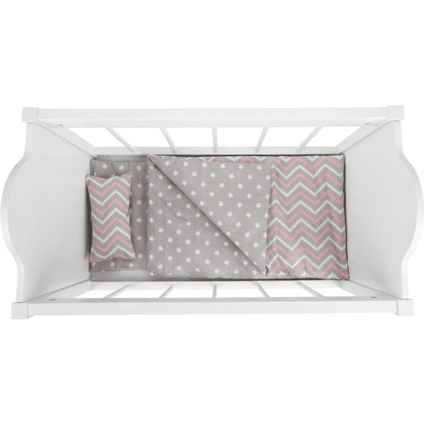 Poppen en knuffels slapen bijzonder goed in dit eenvoudige kinderbedje omdat ze er niet uit kunnen vallen. Dankzij de witte vernis ziet het poppenbed van stevig hout er erg modern uit. Een zacht gevoerde matras en een dekbed en kussen zorgen voor het hoogste niveau van poppencomfort en het omkeerbare bedlinnen met sterrenprint rondt de Design perfect af. Geschikt voor poppen tot ca. 47 cm lang. Een geweldig bed voor alle kleine poppenouders.